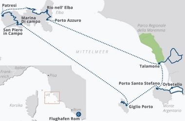 Nach dem Frühstück heißt es heute: wir segeln! Eine lange Überfahrt nach Elba erwartet uns. Bei günstigen Winden erhalten Sie eine Einweisung in die Segelkunde und können gemeinsam Segel setzen. Elba ist nach Sizilien und Sardinien die drittgrößte Insel Italiens und besticht durch Charme, üppige Natur und reiche Geschichte. Sie genießen das Mittagessen an Bord und haben Zeit zum Baden bevor Sie in der geschützten Bucht von Porto Azzuro ankommen. Am Abend können Sie das reizende Hafenstädtchen Porto Azzuro erkunden.